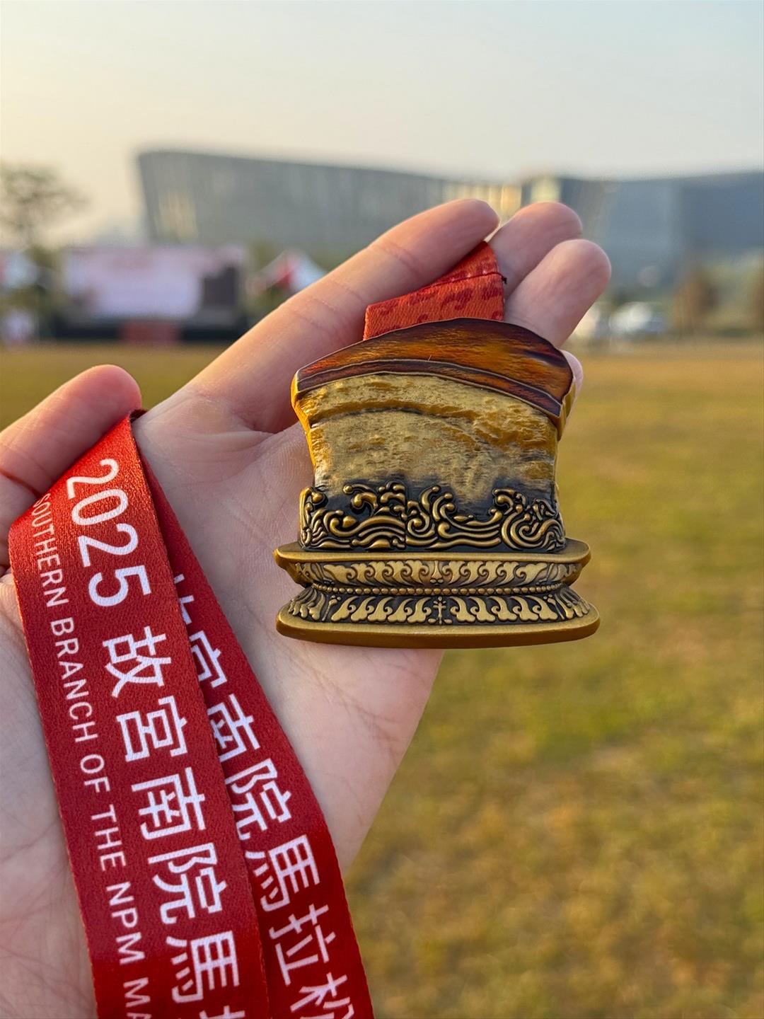 故宮蕭院長表示,今年為故宮百年、南院開館十週年,賽事特別推出全新系列參賽禮與紀念品。以「跑者」、「RUN」與南院建築為靈感,打造今年限定的「故宮南院馬拉松 CI」;以北宋范寬〈谿山行旅圖〉構圖設計紀念巾與提袋,展現崇山峻嶺與天地大觀的壯闊視野,讓跑者能把千年山水畫「披在肩上、帶回家」,成為最具文化價值的參賽禮。此外,最引人矚目的莫過於今年全新亮相的 「肉形石」造型獎牌,金光閃爍、油亮水潤,這塊「史上最具食慾」的獎牌,與前年「毛公鼎」與去年「翠玉白菜」共同組成全套「故宮三寶—酸菜白肉鍋」。只要跑者連續三年完賽即能集滿三寶,深具收藏意義。