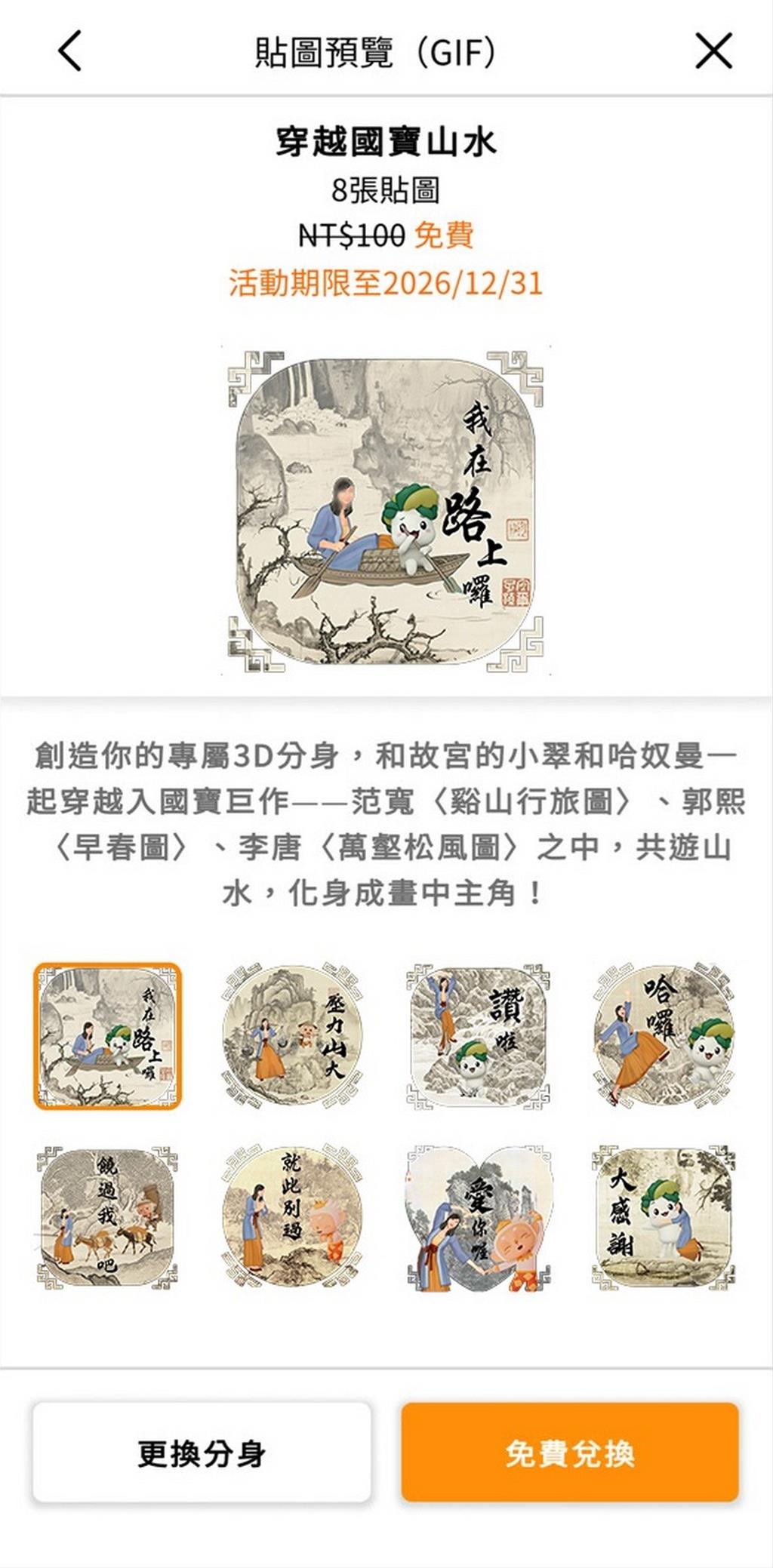 北宋三大家—范寬〈谿山行旅圖〉、郭熙〈早春圖〉、李唐〈萬壑松風圖〉的巨碑式山水,無疑是故宮書畫典藏的「鎮院國寶」,但遺憾的是當代人僅知梵谷而不知范寬,事實上范寬早在一千年前就使用高遠構圖,氣勢雄強;且畫中溪山深虛,水若有聲,這麼有意境的畫作若是能走進去看一看豈不更妙。為此故宮特別和台灣大哥大合作MyMoji 3D貼圖線上製作,只要掃瞄QR code就可穿越千年畫境,不但能體驗一把文青風格外,還可作為各通訊平台的動態貼圖,有趣又實用,預計10月31日正式上線。