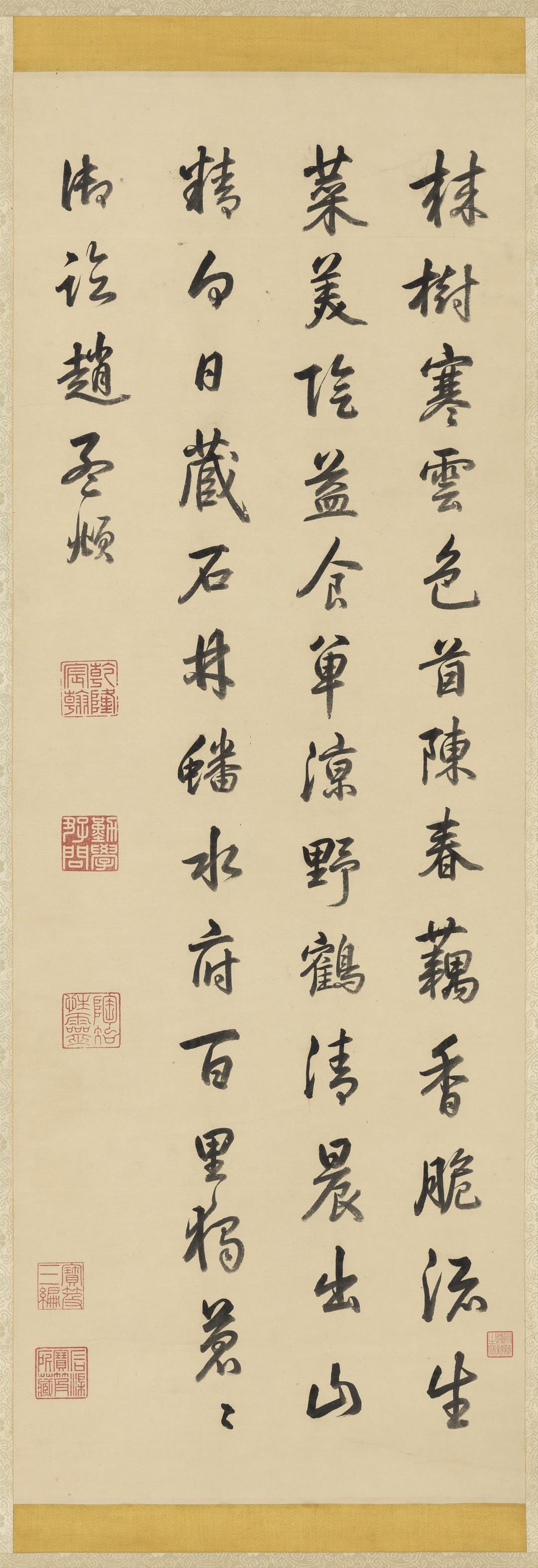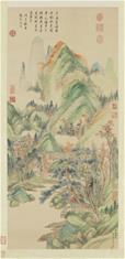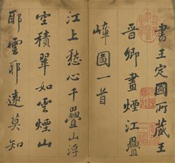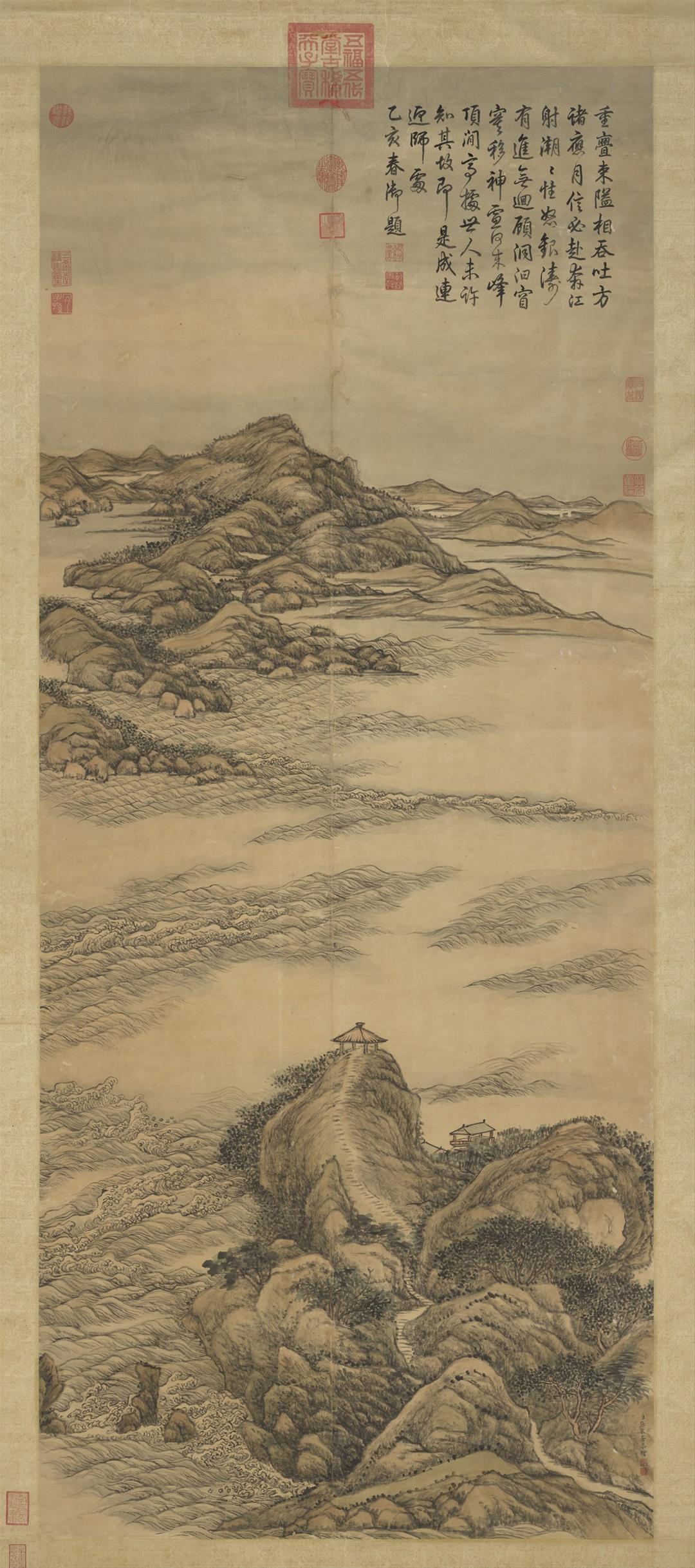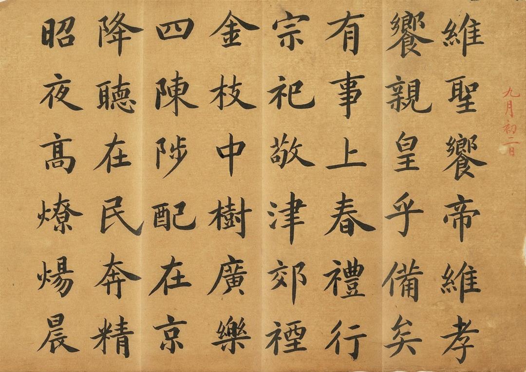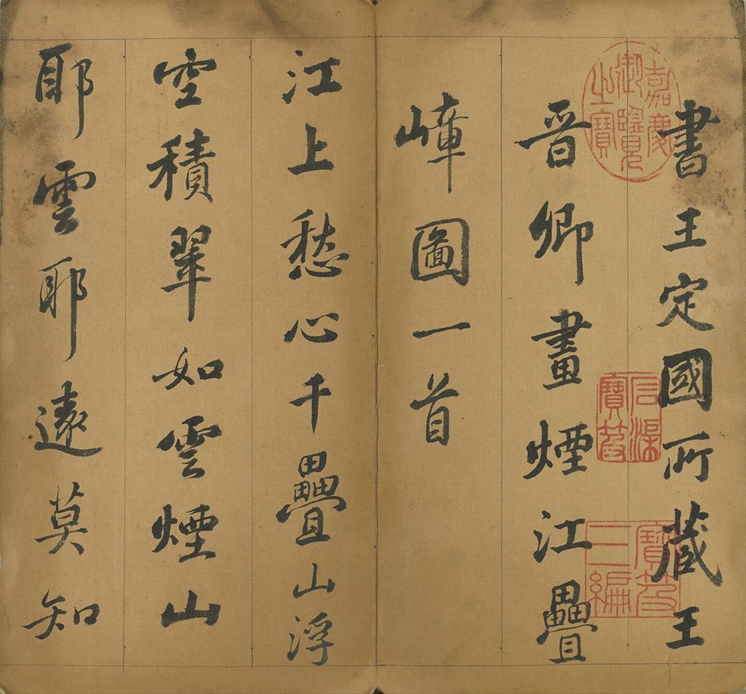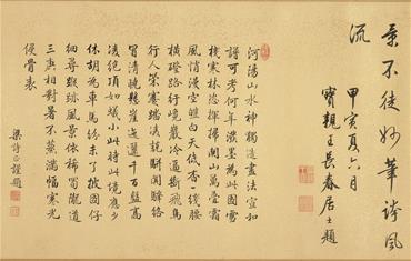 展覽首先從乾隆早年習作切入。弘曆自幼接受嚴格且制度化的宮廷教育,在登基前十餘年間幾乎每日習字。此次展出〈迎送神歌〉,推測書於寶親王時期,雖已具基本結構,但在點畫細節與用筆轉折上仍顯生澀,反映其書寫能力尚在養成階段。與此同時,長年陪伴弘曆讀書習字的梁詩正為乾隆早期的重要代筆者,〈宋 郭熙 關山積雪圖〉畫上寶親王弘曆題詩的秀美書風與精緻用筆,即出自梁詩正代筆。