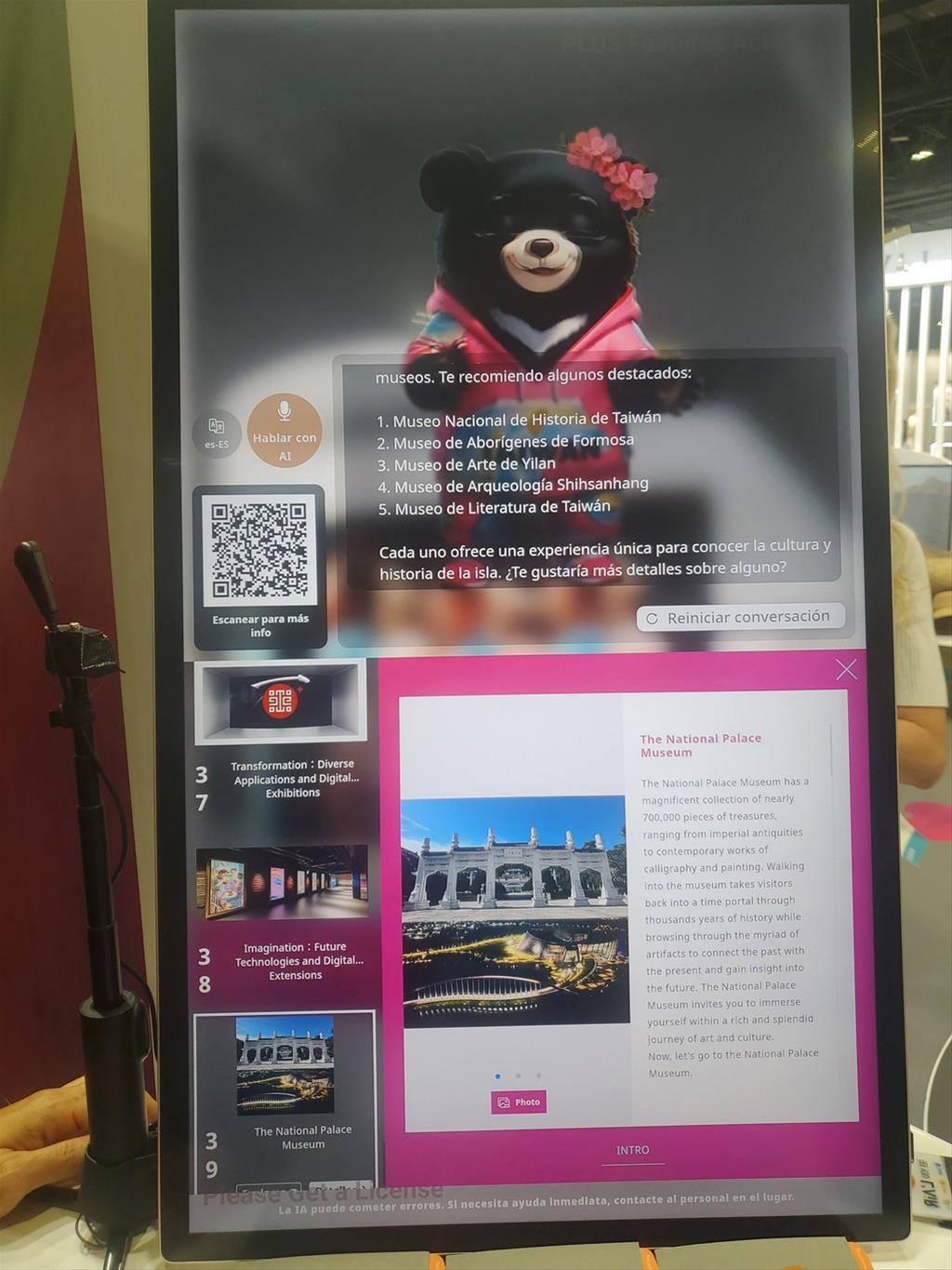 故宮此次展出以「新興科技的崛起」為核心,呈現「數位創新 × 文化永續」的成果,讓觀眾體驗文化與科技的融合。舞台區以LED大螢幕打造亮眼門面,播放故宮百年形象影片《日常之間 Feel the Connection》,展現百年院慶主題「故宮100+」的嶄新形象,象徵百年為起點、邁向未來的無限延伸;中島區域以科技感設計打造未來氛圍,播放《富春印象AI影片》精華版,透過人工智慧生成影像技術詮釋傳世名畫的當代美學;體驗區以互動體驗為主軸,推出「百駿圖AR互動」,觀眾可透過行動裝置進入畫中世界,與奔騰駿馬一同穿越時空;線上虛擬展廳則精選故宮數位發展成果中的精彩內容、回顧數位科技在故宮的發展歷程,讓觀眾不受時空限制,隨時在線上探索經典文物的數位化細節與故事。