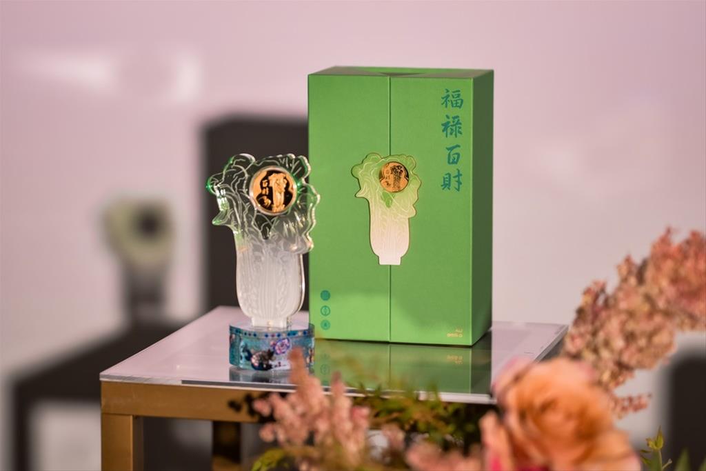 「福祿百財紀念金條」(限量1,000條,售價新臺幣152,000元),融入〈清 乾隆 粉彩福祿壽葫蘆瓶〉紋飾,結合福祿(葫蘆)、百財(白菜)等吉祥意涵,寓意「福祿雙全、富貴綿延萬代」;
