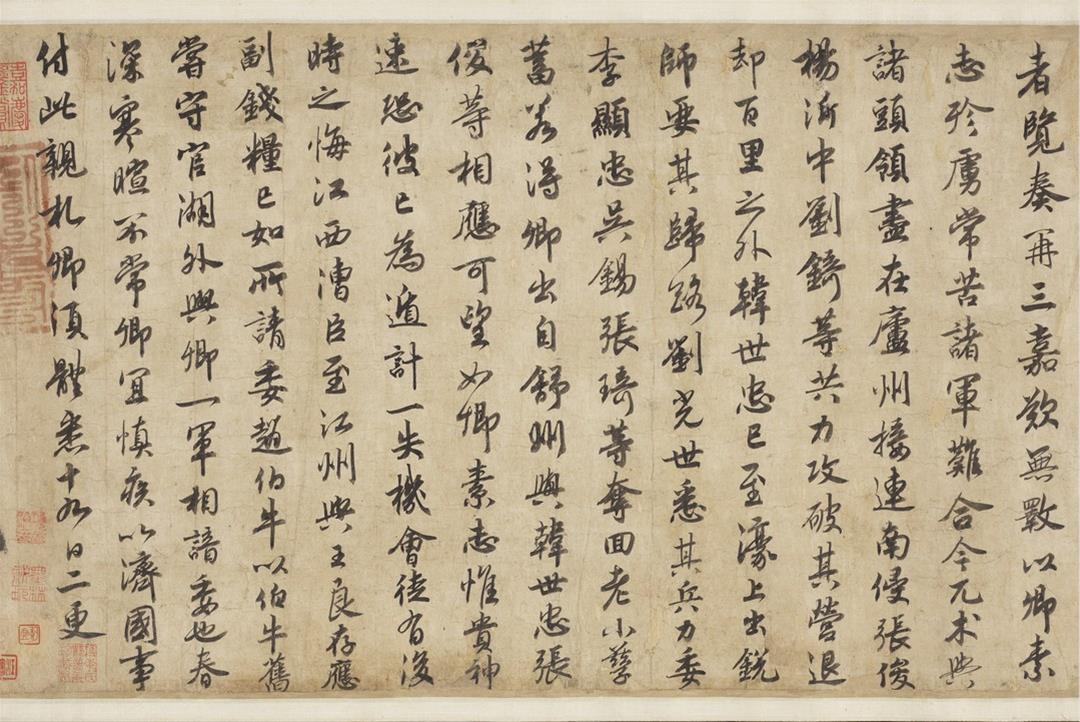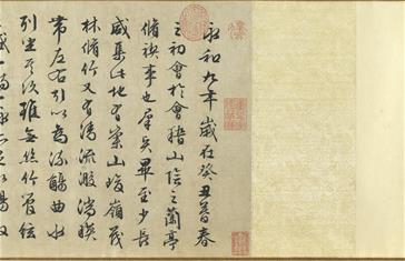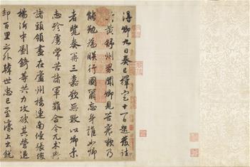 宋高宗與岳飛的君臣書信往來頻繁,然僅兩件倖存於世,本次展出的〈宋高宗賜岳飛批剳〉為蘭千山館寄存作品,書於岳飛死前一年,高宗在此信中慰勉岳飛帶兵辛勞,而細觀其中「領」、「若」、「相」、「良」、「其」等字,可見書學〈蘭亭序〉的痕跡;明四大家之一文徵明於其高齡89歲所書之〈明文徵明書蘭亭敘〉用筆、結字、章法與王羲之原作多不相同,應是意臨之作, 自家書風表露無遺。另亦展出唐代褚遂良、明代董其昌、元代趙孟頫等名家臨〈蘭亭序〉之不同風格之作。