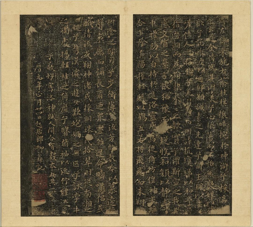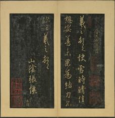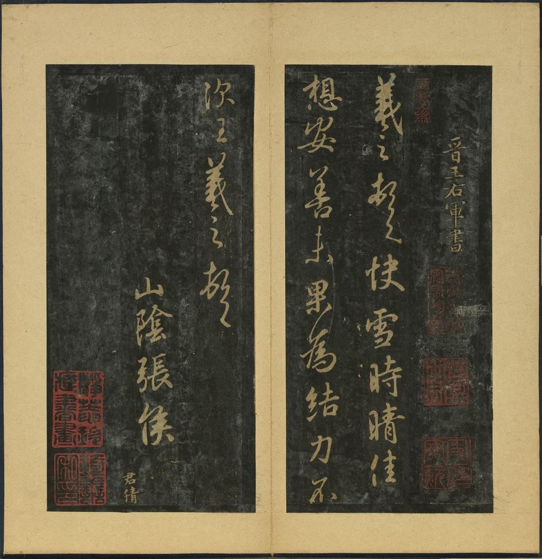 刻帖在活字印刷術發明之前便是古代中國複製書法名家手稿的一種方法,其中精美者在北宋時即有「可降真蹟一等」之稱譽,「晉唐法書刻帖選萃」依照時代先後,以及篆、隸、草、行、楷五種不同書體並列陳示的原則和理念,遴選法書名蹟16組件,包含王羲之的行書〈快雪時晴帖〉、王獻之楷書〈洛神賦〉、唐玄宗隸書〈禪地衹玉冊〉、唐懷素草書〈書論書帖〉等。