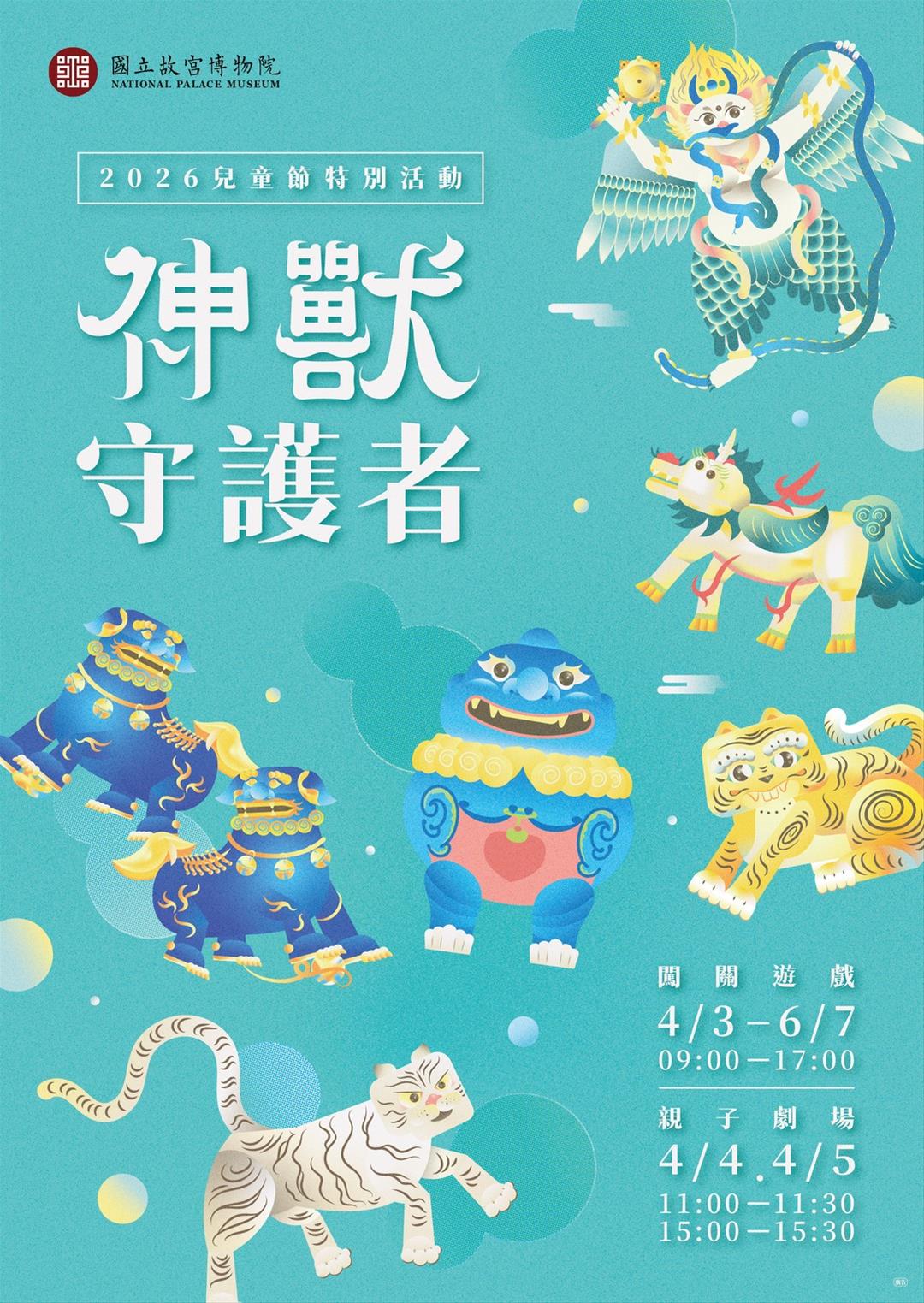 迎接兒童節,故宮北部院區推出「神獸守護者」系列親子活動,歡迎大小朋友探索文物中的神獸文化。4月3日至6月7日推出闖關遊戲,憑當日參觀券可至正館1樓服務臺領取遊戲盒(每位兒童限領1份,限量2,500份)。連假期間活動精彩登場,4月3日推出「神獸瑜珈」親子體驗(須事先報名);4月4日及5日11:00與15:00於正館B1大廳由「小花果玩戲場」帶來結合神獸故事與互動遊戲表演;4月6日10:30與13:30則於B1兒藝中心推出「神獸劇場.虎姑婆與她的朋友」。此外,4月3日至6日每日9:00至16:30,憑當日參觀券可至B1兒藝中心兌換「海獸溜溜球」創意手作材料;持「2026臺北兒童月」探索摺頁可兌換「小翠紙公仔」,數量有限、送完為止。更多活動詳情請參閱故宮官網。