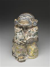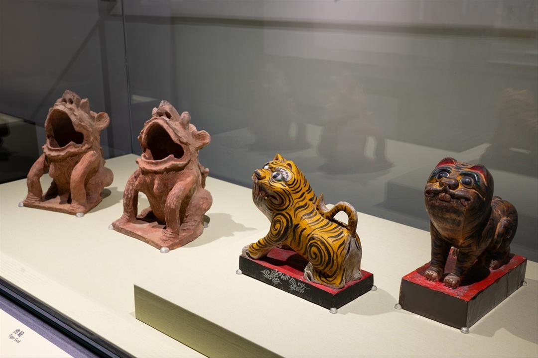 此外,借自臺史博〈虎爺神像〉造型樸拙可愛,虎爺為民間信仰中的動物神,常被安奉於神桌下方,作為神明坐騎或協助傳遞訊息、搬運物品。患腮腺炎的兒童兩頰常腫大異常,俗稱「豬頭皮」,因老虎食豬,民間相傳虎爺具有醫治腮腺炎的神力,又因喜愛小朋友而成為兒童守護神。來自北港朝天宮的「祖媽神轎」則由漳州派傳奇匠師陳應彬於1912年主持完成,於大正年間榮獲「南部物產共進會」紀念賞,是木雕藝術的代表作。神轎上四尊四海龍王雕像守護於轎門與柱邊,象徵四海水族歸順並尊崇媽祖,祈願海安浪平,呈現神獸文化在宗教信仰與民間藝術中的豐富樣貌。