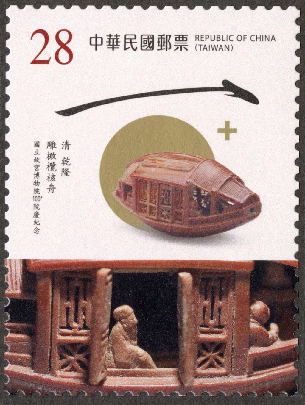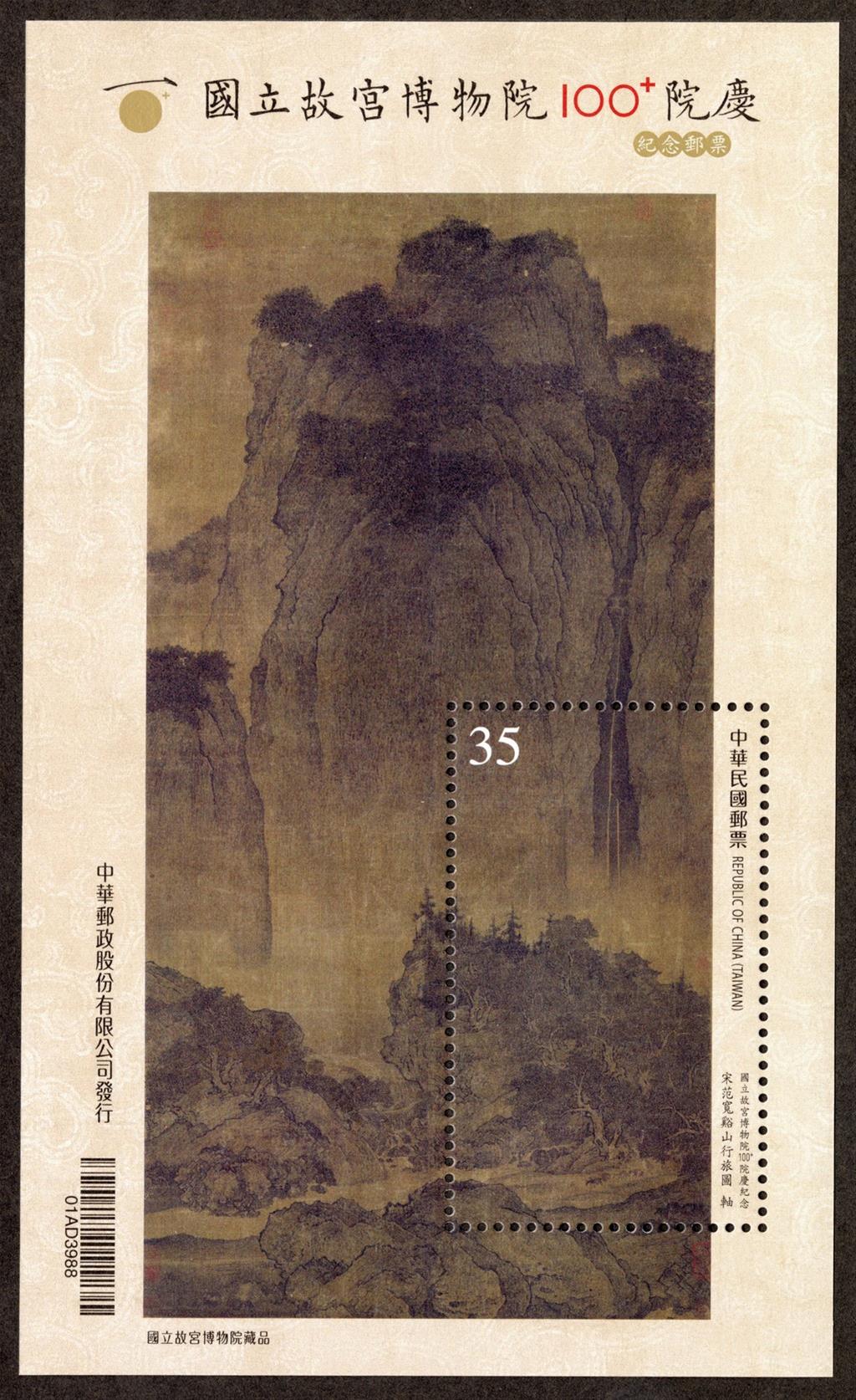 慶祝國立故宮博物院百週年院慶,故宮攜手中華郵政公司發行「國立故宮博物院100+院慶紀念郵票」,精選自今年10月「甲子萬年:國立故宮博物院百年院慶特展」中的五件典藏珍品。此組郵票包含1套4枚,分別為〈商周時期 嬰祖丁鼎〉、〈北宋 汝窯 青瓷無紋水仙盆〉、〈清 乾隆 洋彩玲瓏轉旋瓶〉與〈清 乾隆 雕橄欖核舟〉;以及小全張1張,取材自〈北宋 范寬 谿山行旅圖〉。這些經典文物首度躍上郵票,讓故宮走進大眾生活,也向世界傳遞文物雋永之美。