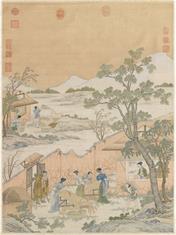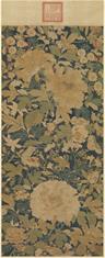第一單元「清宮收藏古代緙繡」,展出清宮珍藏的古代緙繡書畫。國寶〈緙絲富貴長春軸〉為存世宋緙精品,以藍色絲線為底,交織牡丹、月季(又名長春花)、菊花、芙蓉等花卉,緙工細密,色彩明麗,寓意「富貴長春」。第二單元「織造華美緙繡」,則呈現清宮緙繡的豐富題材與精美工藝。〈緙絲村農韶慶圖〉與〈緙絲場圃秋成圖〉兩件掛軸,圖案源自清康熙年間起相當重視的《耕織圖》,前者表現村夫搗米,老少圍爐取暖的溫馨場景;後者則是農人簸揚穀物,整理稻穗的豐收圖景,表現清代對農耕社會的理想描繪。