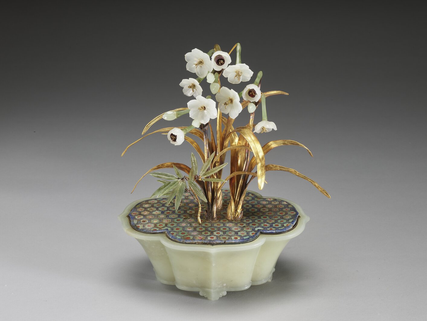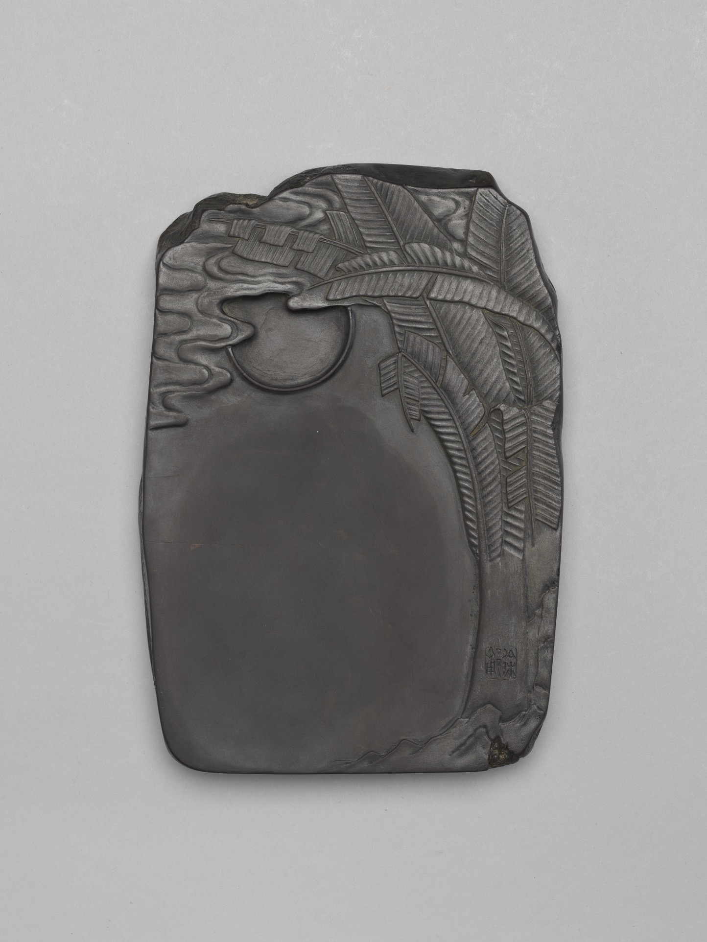 硯的主要功能為研墨,因此須具備硯池與硯堂。工以圓月為硯池,再以整株蕉樹與一抹浮雲相配,營造出空靈清遠的景致。