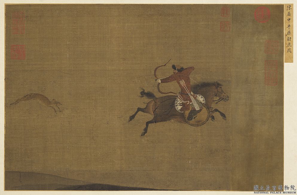 陳居中(約十三世紀)為南宋寧宗嘉泰年間(1201-1204)畫院待詔。擅長人物畫及番(蕃)族人馬畫,特別是打獵生活或邊疆放牧等題材。本幅畫人馬射獵的場景。獵人在馬匹奔馳的同時,轉身挽弓瞄準身後的獵物。野鹿身軀呈現弧狀,前腳略有彎曲,似是注意前方的獵人,正欲緊急煞車。畫家生動地捕捉打獵的瞬間,透過人和動物細緻的肢體動作,傳達出緊張的氣氛。