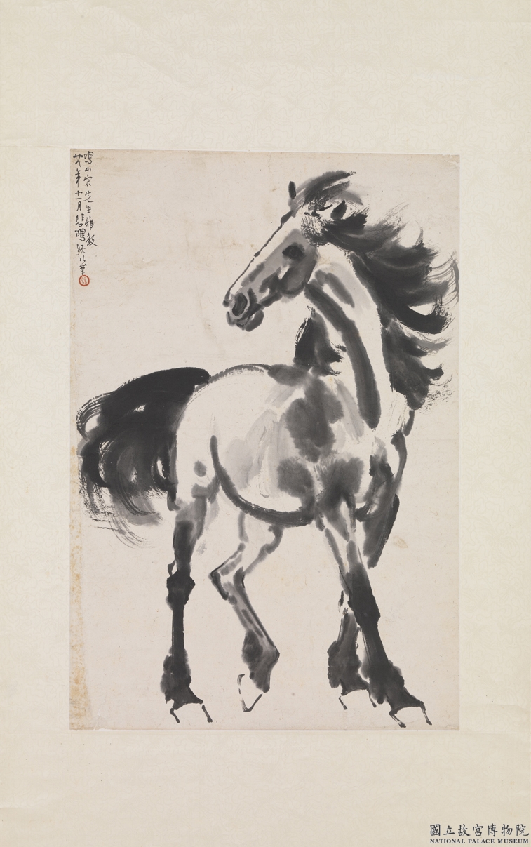 徐悲鴻(1895-1953)以畫馬聞名。他曾在法國學習西洋繪畫技法,將西方寫實主義繪畫結合中國傳統筆墨,創造出中西合璧的新畫風。他深入研究馬的身體結構,並作出大量速寫稿,因此能以簡易的大寫意技法,畫出精準的造型。