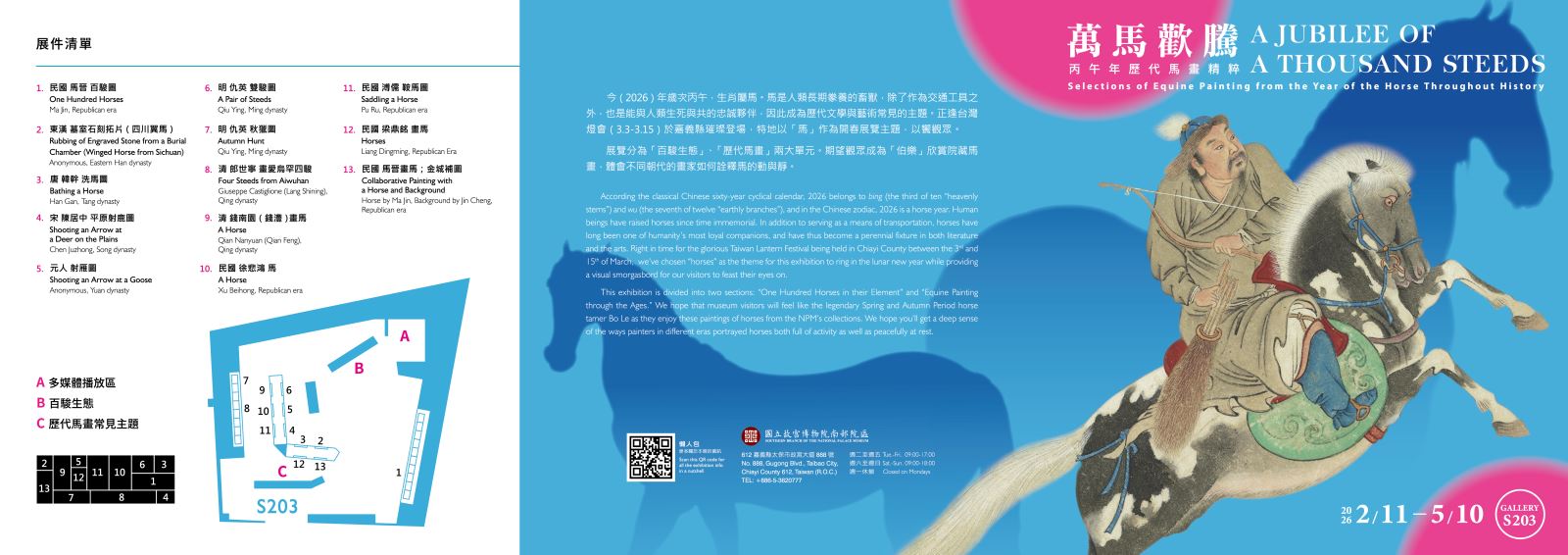 今(2026)年歲次丙午,生肖屬馬。馬是人類長期豢養的畜獸,除了作為交通工具之外,也是能與人類生死與共的忠誠夥伴,因此成為歷代文學與藝術常見的主題。正逢台灣燈會(3.3-3.15)於嘉義縣璀璨登場,特地以「馬」作為開春展覽主題,以饗觀眾。